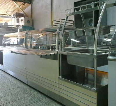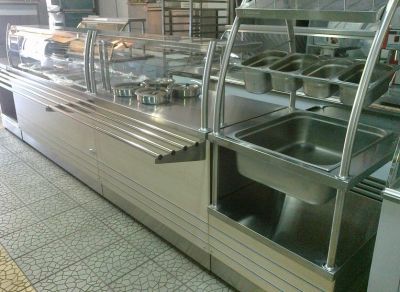 Linie calda de autoservire cu loc pentru impinge tava, compus din 2 mese calde, un corp pentru casierie si o etajera pentru tacamuri si vesela, firma Ottoman, dimensiuni: 447x70x127 cm , foarte putin folosita pret 3000 Euro.