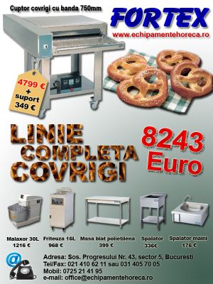 PROMOTIE! Linie pentru covrigi compusa din: Cuptor electric tip tunel pentru covrigi, productivitate 500 - 800 buc/ora, constructie otel inox, dimensiuni banda transportoare 1300x750mm, panou actionare, temperatura de lucru 50 - 400°C, alimentare 380V, putere 14,5Kw, dimensiuni 1130x1770x350mm + Suport + Malaxor 30L + Friteuza 16L cu suport + Masa cu blat de polietilena 1,5m + Spalator cu 1 cuva + Spalator maini. Pret 8243 Euro. Website: www.echipamentehoreca.ro , Tel: 0731 347 077