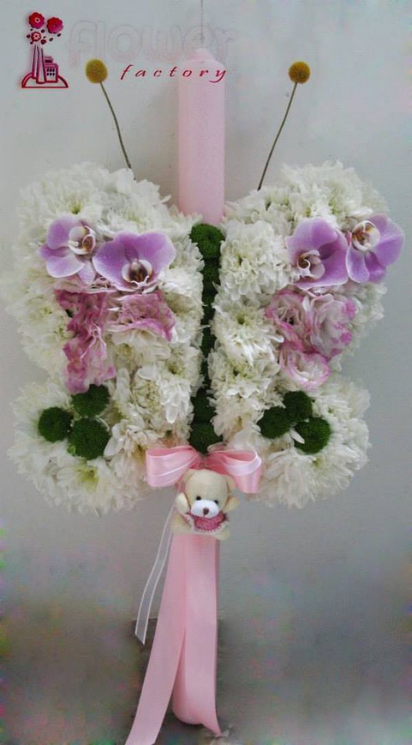 Realizam, la comanda, lumanari de botez unicat, in forma de fluturas(ursulet, albinuta). Lumanari ceara 60-70 cm, decor floral in forma de fluture din crizanteme, orhidee,santini.
