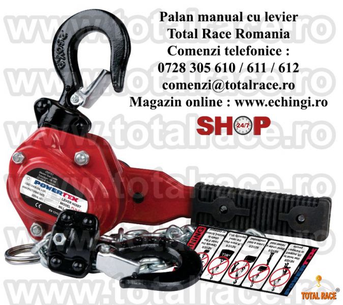 Total Race livreaza din stoc Bucuresti palan manual cu levier , capacitate 0,25 t /0,5 tone / 1,5 tone / 3 tone / 6 tone , inaltime 1,5 metri cu carcasa din otel pentru deplina siguranta , franare automata in sarcina , carlige de ridicare cu rulment cu bila , palan levier productie Suedia. Lantul de sarcina al palanului este acoperit cu strat de protectie anticoroziv. Palanele manuale sunt echipate RFID pentru o usoara intretinere si inspectie. Pentru preturi , date tehnice si stoc accesati magazin online : www.echingi.ro