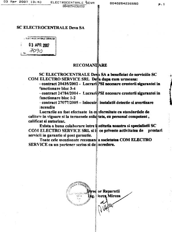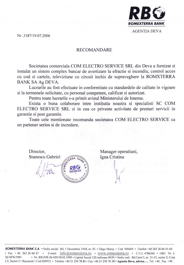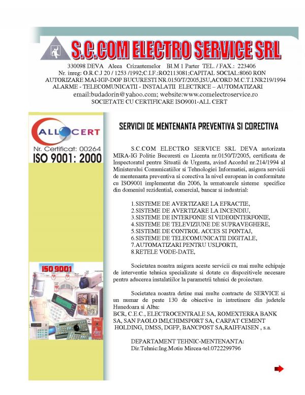 S.C.COM ELECTRO SERVICE SRL DEVA va sta la dispozitie cu servicii de proiectare,montaj si mentenanta ,solutii si sisteme de calitate superioara la cel mai bun raport calitate/pret de pe piata!Societatea noastra detine toate licentele si avizele necesare proiectarii,montajului si mentenantei sistemelor de alarmare la efractie,incendiu,supraveghere video,control acce,interfonie si videointerfonie.Detinem un numar de 12 angajati cu vechime de peste 20 de ani in domeniu,licentiati MIRA si IGSU,dotati cu mjloace tehnice necesare pentru ducerea la indeplinire a celor mai complexe sarcini in domeniu.