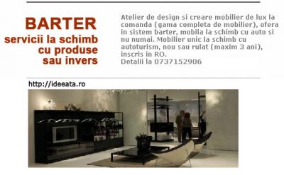 Atelier de design si creare mobilier de lux (gama completa de mobilier), ofera in sistem barter, mobila la schimb cu auto si nu numai. Mobilier unic la schimb cu autoturism, nou sau rulat (maxim 3 ani), inscris in RO. Detalii la 0737152906