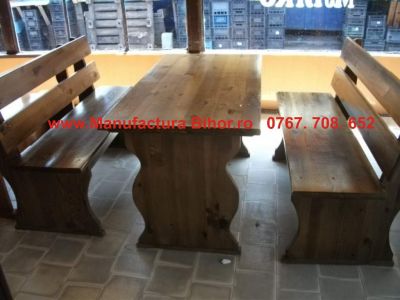 Oferta tine cont de cerintele pietei, astfel putem executa la comanda urmatoarele tipuri de mobilier: foisoare de gradina, pergole, mese, banci, scaune, mobilier rustic de gradina, terase din lemn, leagane, balansoare, fantani ornamentale, podeturi pentru gradina, seturi de joaca pentru copii, gard decorativ, accesorii din lemn pentru gradina.