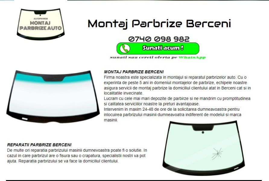 Firma noastra cu o experienta de peste 5 ani in domeniu, ofera servicii de montaj si reparatii parbrize auto pentru orice model auto atat in Berceni si localitatile invecinate.