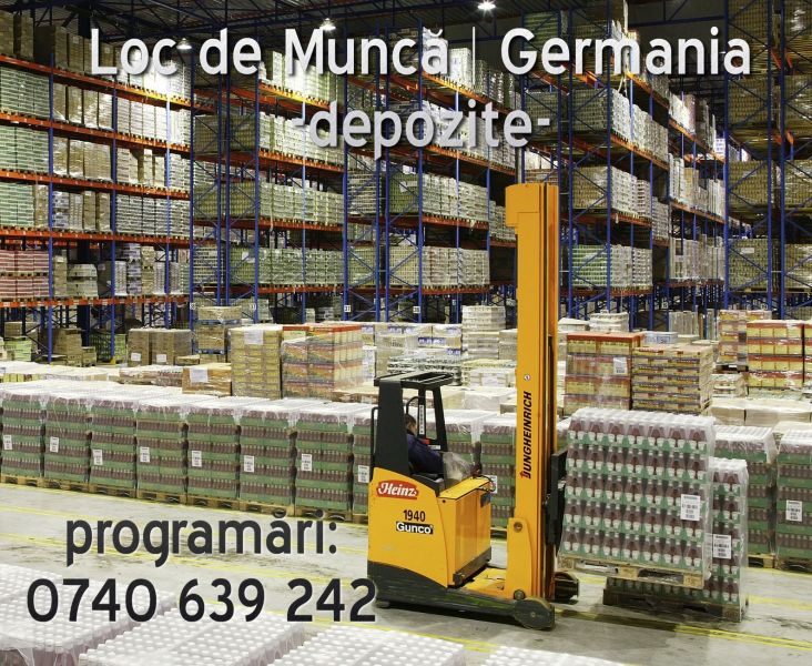 - Se cauta personal necalificat(femei, barbati), pentru munca in depozite la etichetat produse in Germania. Salarii incepand cu 1400E/luna, contract legal de munca pe perioada nedeterminata. Pentru mai multe detalii va rugam sa ne sunati de L-V intre orele 9-17 la nr de telefon 0740639242.