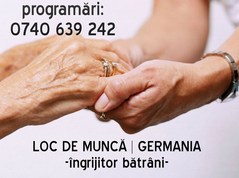 - Se cauta femei,barbati,cupluri/grupuri de persoane pentru munca in depozite in Germania. Salarii incepand de la 1400E/luna, cazare si o masa asigurata de catre angajatorul neamt. Pentru detalii si programari va rugam sa ne sunati de L-V intre orele 9-17 la nr de tel 0740639242