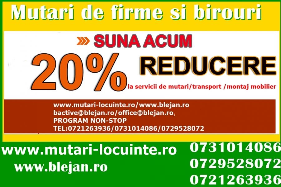 - Preturi fara concurenta, oferte imbatabile, totul intru-n singur loc. Cu noi va puteti muta sediul firmei sau locuinta personala, cu un buget dinainte stabilit . Suntem flexibili si ne adaptam serviciile in functie de doleantele si bugetul dumneavoastra.