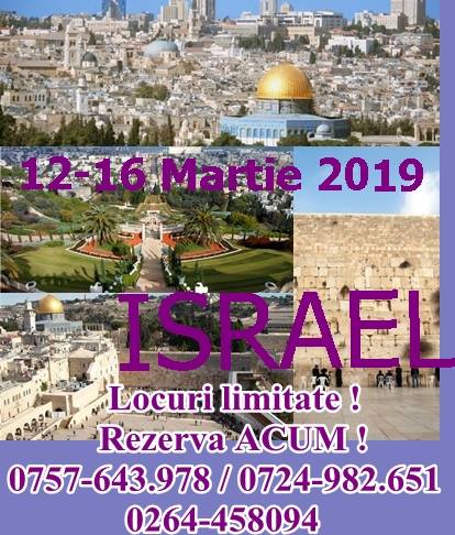 - O vacanta speciala in Israel 12-16 Martie 2019 , plecare cu avionul din Cluj Napoca, care încearcă să abordeze înţelesul profund al Ţării Sfinte, o experienţă care atrage prin locurile încărcate de istorie, religie şi cultură, care laolaltă formează o adevărată Mecca a culturii şi patrimoniului universal, care au păstrat peste secole amprenta inconfundabilă a unor civilizaţii străvechi. Rezerva ACUM pentru a petrece cateva zile minunate incarcate de emotii adevarate alaturi de persoane minunate din Grupul MiraSingles. Pret oferta acum ! 0742251153 nu sms