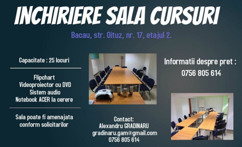 Capacitate : 25 locuri ; Dotari : Flipchart, videoproiector cu DVD, sistem audio ; notebook ACER la cerere . Sala poate fi amenajata conform solicitarilor . Locatie : Bacau, str. Oituz, nr. 17, etajul 2 . (central, langa Tribunalul Bacau). -