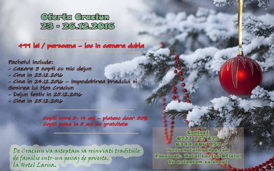 4 zile / 3 nopti cazare + demipensiune + masa festiva ( 25.12.2016) 499 lei/pers/sejur -