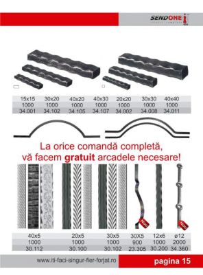 Va asteptam cu o bogata oferta promotionala la preturi fara concurenta pentru urmatoarele produse:arcade fier forjat, cutii postale fier forjat,elemente C si S fier forjat,elemente de mijloc si legatura fier forjat, elemente spiralate fier forjat, flori si rozete turnate fier forjat, frunze turnate si forjate fier forjat, manere fier forjat, montanti curbati fier forjat , montanti drepti fier forjat si prim montanti fier forjat, panouri balustrade fier forjat , platbanda amprentat fier forjat, teava amprentata fier forjat , role pentru porti din fier forjat, balamale fier forjat, rozete fier forjat si panouri forjate , silduri fier forjat , varfuri fier forjat.