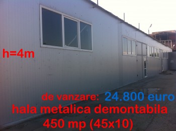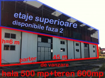 Inchiriere 150 - 500 mp pret: 300-1200 e / luna sau vanzare 2 buc hale metalice h = 4 si 6m, pereti sandwich, in cazul vanzarii: prima hala se demonteaza si are pretul 24800 euro (450 mp). cea de a doua se vinde numai cu teren aferent 600 mp (total suprafata 1100mp) pret: 219000 e. dispun de platforme beton