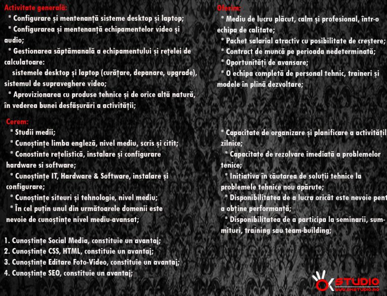 Spune-ne parerea ta despre anuntul "OkStudio Bucuresti oferta angajare tehnician IT".