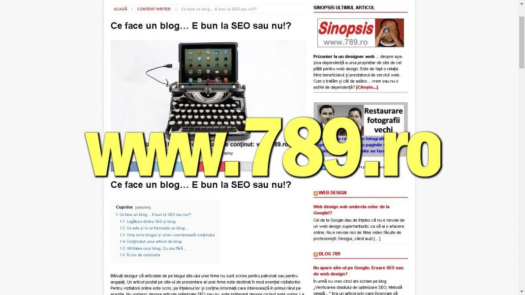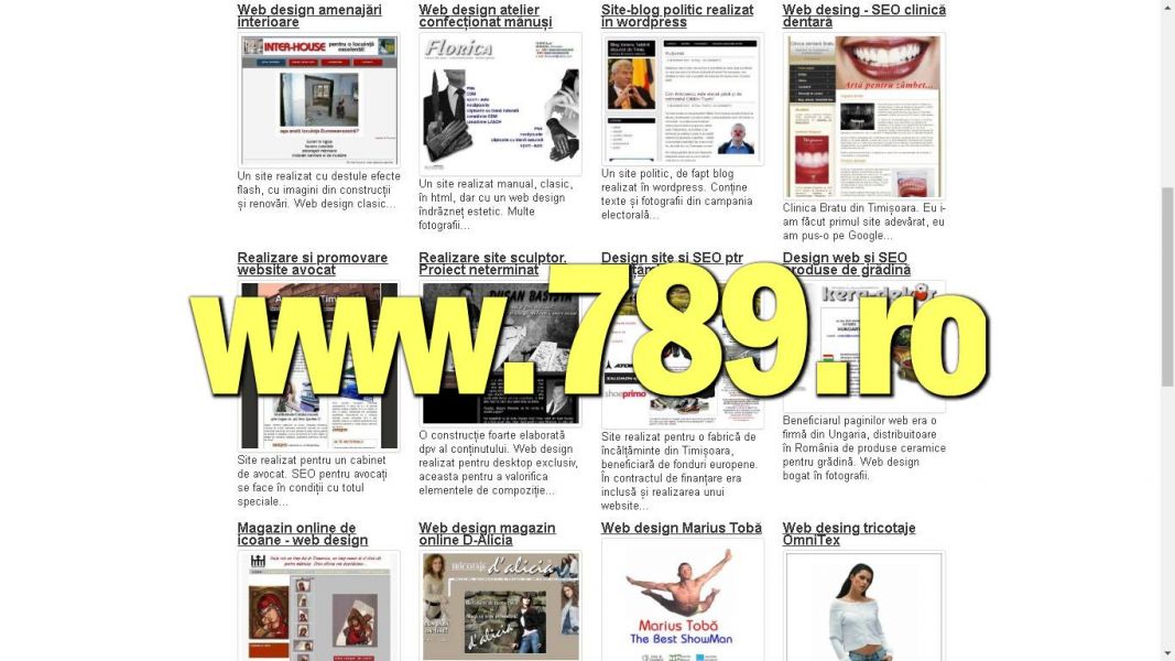 - Optimizare SEO Timisoara servicii web oferite de freelancer. Optimizare site-uri in wordpres, html, magazine online. Vechime in activitatea online din anii 90, din vremea cand internetul era pe dial-up. Ofer servicii de creare site-uri, web-design pe bază de template, realizare si editare de continut nou sau corectie a celui existent. Articole advertoriale, administrare bloguri. Vizitati www.789.ro