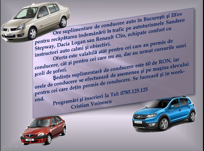 Ore suplimentare de conducere auto în Bucureşti şi Ilfov pentru recăpătarea îndemânării în trafic pe autoturismele Sandero Stepway, Dacia Logan sau Renault Clio, echipate confort cu instructori auto calmi şi obiectivi.