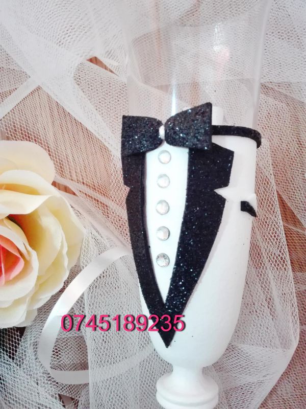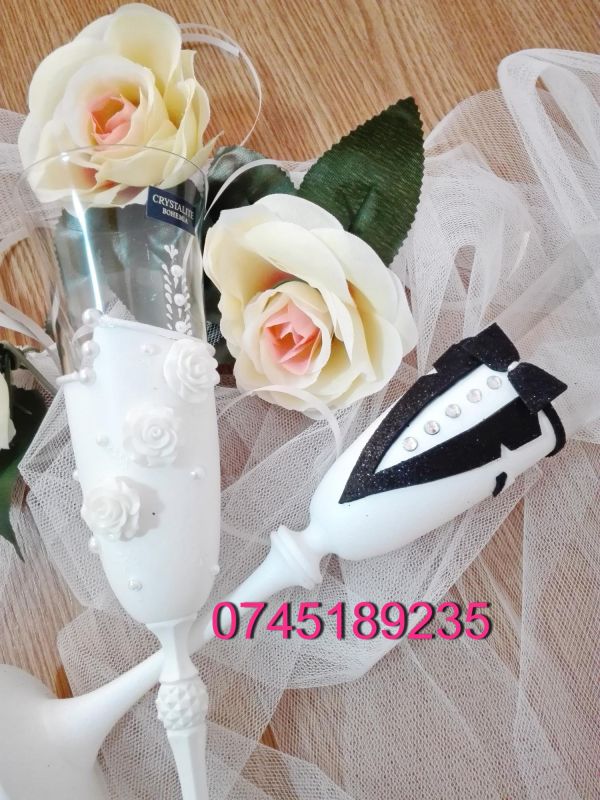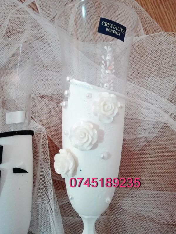- Pahare elegante din Cristal de Bohemia pictate manual si cu perle albe, de culoare ivory specifice pentru un eveniment deosebit. Paharele de nunta sunt decorate cu diferite accesorii, perle, flori artificiale, brose, strasuri. Paharele se pot realiza si in alta combinatie coloristica. Inaltimea paharelor este de 26 cm si vor fi de un design aparte la evenimentul dumneavoastra . Ne puteti contacta 0745189235, 0771202875.