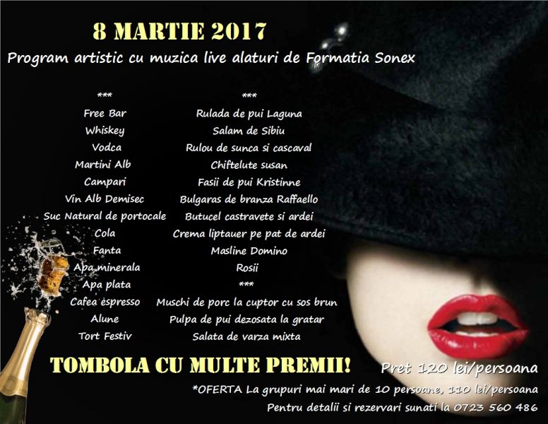 - Va invitam sa petrecem impreuna ziua de 8 Martie, intr-o atmosfera de sarbatoare si un program artistic cu muzica live alaturi de formatia Sonex, si nelipsita Tombola cu multe Premii!