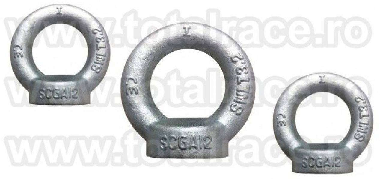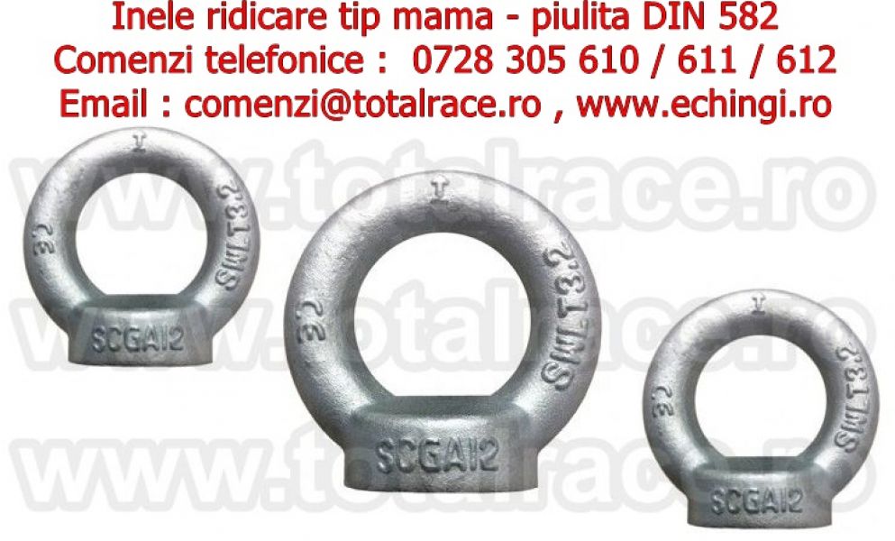Total Race livreaza din stoc Bucuresti : inele de ridicare piulita ( inele de ridicare tip mama) DIN 582 , inele de ridicare cu filet interior DIN 582, ocheti de ridicare piulita, piulita cu ureche , inel piulita DIN 582 , inel de ridicare pentru deplasarea greutatilor , ochet piulita , piulita inelara DIN 582 capacitati intre 90 kg – 20000 kg, inele ridicare piulita, inele DIN 582 dimensiuni M6 – M64.