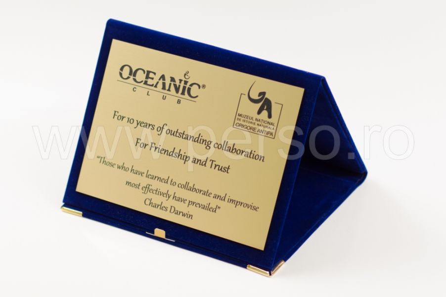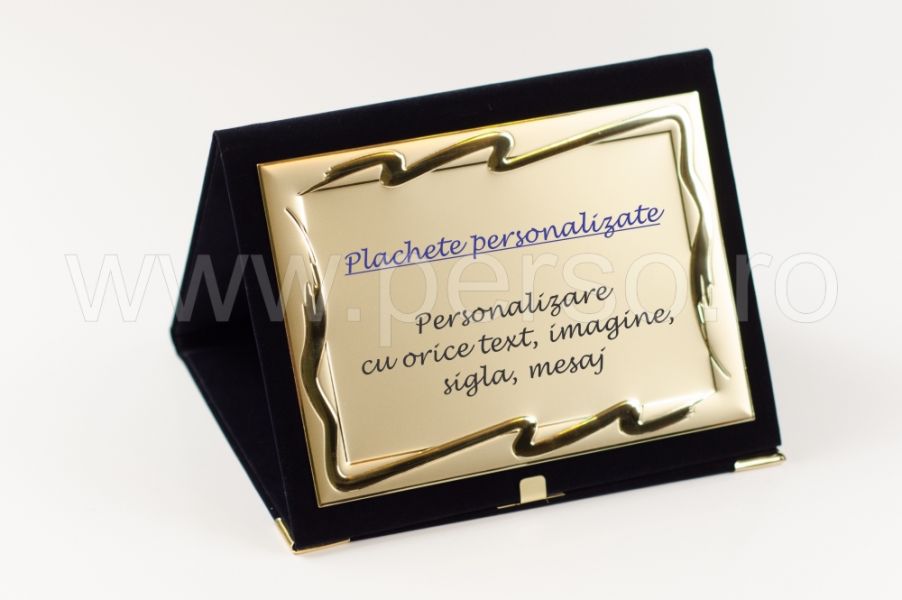 - Confectionam in atelierul propriu plachete personalizate, plachete din alama, plachete din aluminiu si plachete din materiale plastice gravate sau printate UV. Va oferim diplome gravate in casete de plus, plachete personalizate in casete catifea, mape din plus cu placute gravate, potrivite pentru diferite ocazii. Produse pentru premiere: plachete de excelenta, diplome de merit, plachete pentru castigatori, plachete personalizate pentru concursuri, plachete gravate cadou pentru colaboratori, plachete de multumire pentru angajati, placute gravate in mape din plus care pot fi oferite in cadrul unor festivitati pentru personane deosebite. informatii, comenzi si preturi plachete gravate la info@perso.ro