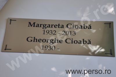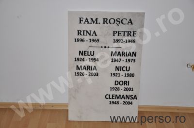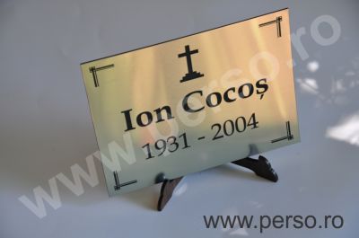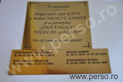 - Realizam placute gravate pentru cimitir din diferite material special concepute pentru exterior.Gravam placi din marmura si granit. Suplimentar, gravura poate fi vopsita cu negru sau alta culoare.Executam placi metalice gravate pentru cimitir, placi din ABS gravate pentru cruci, placi funerare gravate de diferite forme si dimensiuni, in functie de necesitatile clientilor.Gravura se face computerizat nu manual si astfel obtinem placate funerare gravate cu litere si semne bine conturate. Placile gravate se pot inscriptiona cu nume, ani, mesaje si diferite elemente de decor.Preturile se stabilesc in functie de fiecare lucrare in parte, tinand cont de material, dimensiune si informatia gravata.Pentru detalii, preturi si machete va rugam sa ne contactati la office@perso.ro