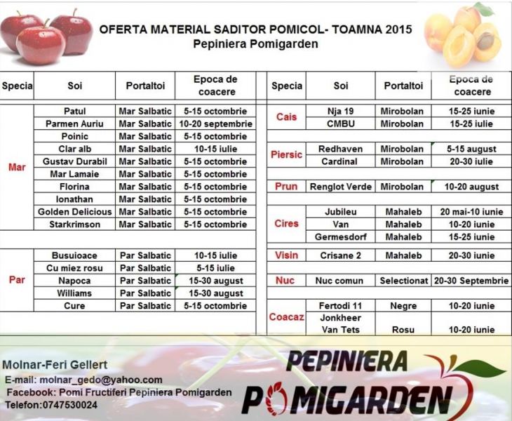 Pepiniera Pomigarden, produce si comercializeaza pomi fructiferi si arbusti fructiferi de īnalta calitate pentru īnfiintarea plantatiilor comerciale si gospodaresti.