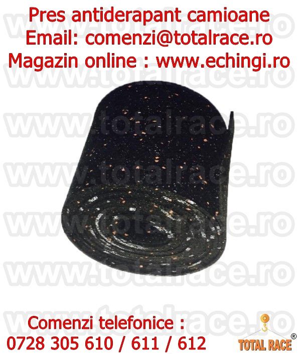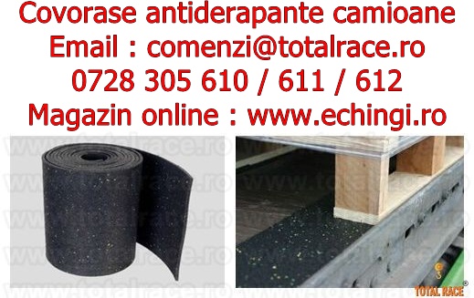 Total Race livreaza din stoc Bucuresti covorase antiderapante dimensiuni 5000x150x4 mm , pres antiderapant tip rola lungime 5 metri , latime 150 mm si grosime 4 mm , covor antiderapant camioane latime 150 mm , presuri antiderapant camioane latime 150 mm , covoras antiderapant tip rola 5 metri grosime 4 mm , rola pres antiderapant , covoras antialunecare tip rola 5 metri grosime 4 mm. Presul antiderapant se aseaza intre marfa si podea pentru o mai buna stabilitate a marfurilor pe timpul transportului.