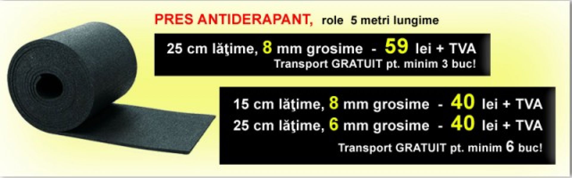 Spune-ne parerea ta despre anuntul "Pres antiderapant - rola 5 metri - latime 25 cm - grosime 8 mm - 59 lei+tva".