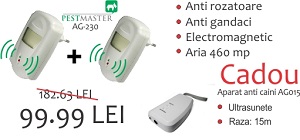 - Doua Aparate AG230 anti gandaci, rozatoare si un aparat anti caini AG015 la pret promotional de 99.99 ron. Pestmaster AG230 este un aparat universal impotriva gandacilor, rozatoarelor, soarecilor, sobolanilor, insectelor taratoare, iar Pestmaster AG015 este un aparat cu ultrasunete anti caini. Comandati pe roinsect.ro si le primiti in 24 de ore.