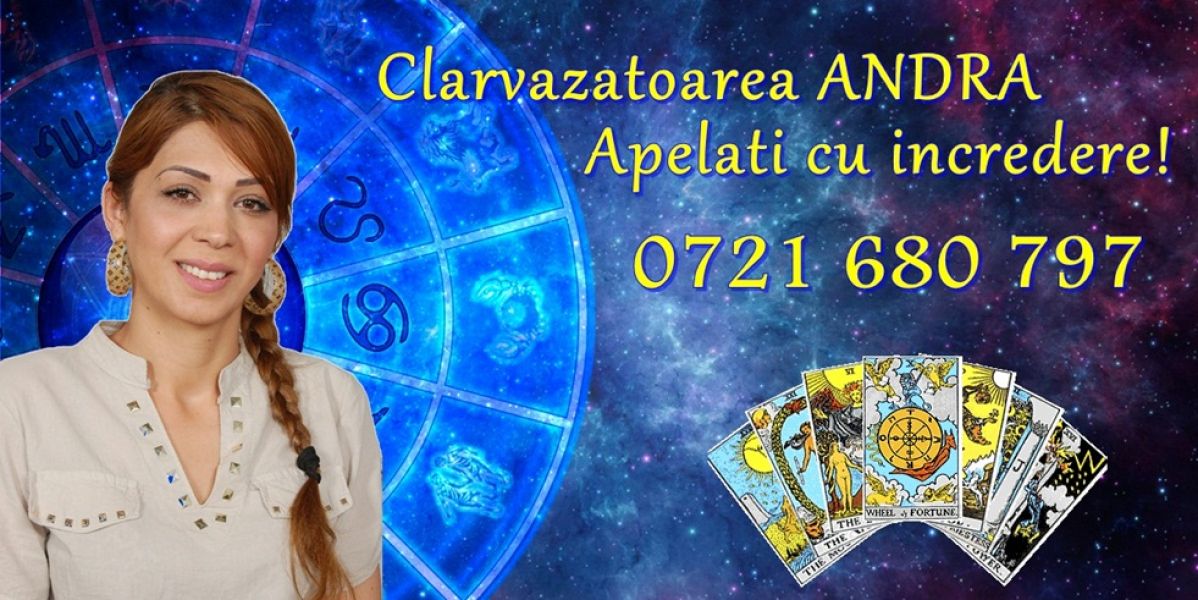 - Prezicatoarea Andra deschide cartile de tarot, chiar si prin telefon.Ea vine in ajutorul vostru cu leacuri si descantece,rezolvand orice problema aparuta in viata dumneavoastra.Tot ce trebuie sa faceti este sa sunati si in baza datelor personale ea va ofera asistenta indiferent de locul unde va aflati sau probema pe care o aveti.Apelati cu incredere!0721680797