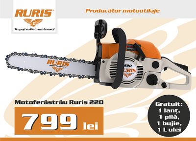 - Ruris - producator motoutilaje. Promotia lunii la Ruris! Motoferastraul "Ruris 220" - motor 1,75 CP la 799 lei. Gratuit primiti un lant, o pila, o bujie si un litru de ulei. Pentru mai multe detalii accesati www.ruris.ro sau contactati cel mai apropiat dealer autorizat Ruris. Ruris, trup si suflet romanesc!