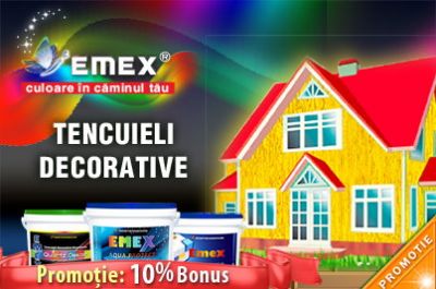 - Pentru ca vremea rece se apropie cu pasi repezi, Romtehnochim vine cu ultima promotie pentru acest an si va ofera 10% BONUS la Tencuielile Decorative Emex, pentru orice culoare. Dupa ce selectati produsul, din pagina principala, triunghiul din dreapta-jos va deschide o fereastra unde puteti completa datele Dvs. Veti obtine codul de promotie ce va va aduce bonusul de 10%. GRABITI-VA ! Acceseaza acum http://www.emex.ro/tencuieli-decorative.html