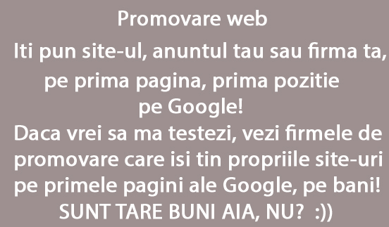 - Promovare web SEO accesibila oricui. Vrei ca site-ul sau anuntul tau, firma ta, sa se gaseasca pe prima pagina, prima pozitie pe motorul de cautare Google, la anumite cuvinte-cheie alese de tine? Vrei ca anuntul tau sa se 'imprieteneasca' cu robotii Google si sa fie gasit repede de potentialii tai clienti? Atunci, ai gasit omul potrivit! Iti promovez site-ul asa cum nimeni nu a facut-o. De ce spun asta? Pentru ca nu am o firma cu 5 angajati care sa lucreze cu cate 10 site-uri fiecare. Sunt singur si nu imi place aglomeratia. Daca ai venit la mine, fii sigur ca ma voi ocupa de site-ul tau timp de o luna. Doar de site-ul tau! Nu vreau sa ma injuri sau sa imi faci reclama negativa. Nu vreau sa iti iau banii si sa ma prefac ca eu muncesc pentru tine. Daca intr-o luna, site-ul tau, anuntul sau firma ta nu sunt primele in prima pagina Google, cand scrii un cuvant cheie,oricare dintre cele 6-7 alese de tine, ma voi ocupa de el pana va ajunge sa se ridice la asteptarile tale. Adica, daca un om