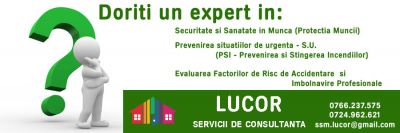 - Firma abilitata MMSSF, ofera serviciu extern in domeniul protectiei muncii si PSI-evaluare riscuri la locul de munca, documentatii SSM (plan de prevenire si protectie, tematici, instructiuni proprii, testare, etc.),organizarea activitatii PSI,audit conformitate SSM,cercetare accident de munca,instruirea angajatilor.Reprezentam angajatorul in fata organelor de control.Preturi negociabile,seriozitate,punctualitate.Referinte, experienta, consiliere.T:0766237575;0724962621