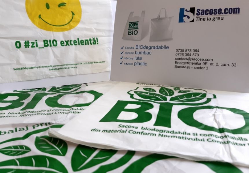 Produsele au imprimat, la baza, textul obligatoriu legal: Sacosa biodegradabila si compostabila din material conform normativului comunitar EN 13432.