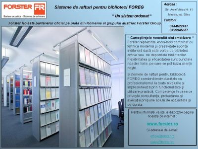 - Forster Ro este partenerul oficial pe piata din Romania al grupului austriac Forster Group. Versiunea mobila a sistemului de arhivare FOREG 2000 inglobeaza toate calitatile solicitate de un sistem de depozitare si arhivare de inalta performanta.