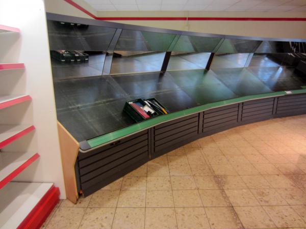 -aproximativ 5,00 m de rafturi noi din lemn tip insula pentru fructe și legume, inaltime: 1,20 m,gri