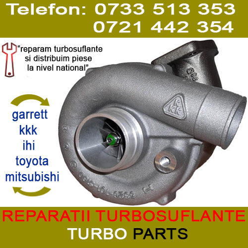 Service-ul nostru ofera reparatii turbosuflante KKK, Garrett, Ihi, Toyota, Mitsubishi pentru orice model de masina la cele mai avantajoase preturi. Pentru orice reparatie facuta de service-ul nostru sau orice turbosuflanta cumparata primiti o garantie de 12 luni fara limita de km. Reparam turbine si distribuim piese originale in toata tara cu ajutorul firmelor de curierat rapid.