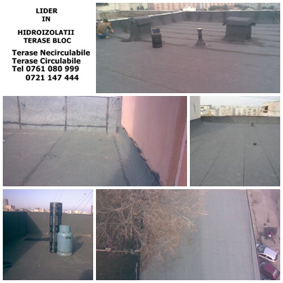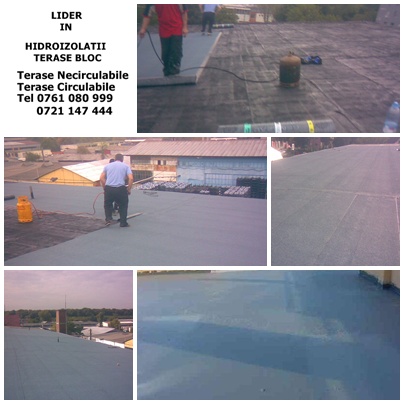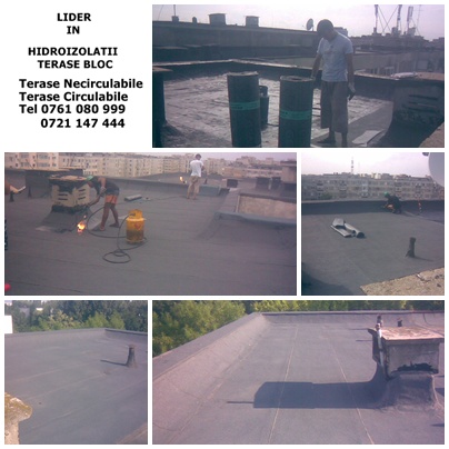 Firma cu echipa completa executam orice lucrare de hidroizolatie sau reparatii la terase si balcoane cu membrane bituminoase tip ardezie atat pentru persoane fizice, cat si pentru firme. Preturi decente, seriozitate, portofoliu mare in lucrari executate.Folosim membrane bituminoase sau hidroizolatii lichide. - Nu ezitati sa ne contactati. Tel 0721.147.444 / 0761.080.999 - email: izolatieterase@yahoo.com . www.izolamterase.go.ro