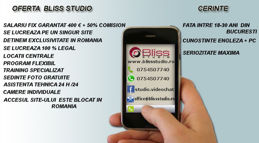 La Bliss Studio castigi lunar 400 euro salariu fix plus comision 50 %.Angajam modele streaming online si oferim cele mai bune conditii ca sa poti castiga banii zambind.Se lucreaza 100%legal.Programul este flexibil.Vei lucra pe un singur site,acesta fiind cu exclusivitate numai in studiourile noastre. Locatii ultracentrale,moderne dotate cu aparatura de ultima generatie.Locurile sunt limitate.Nu ezita sa ne contactezi. www.blissstudio.ro ; office@blissstudio.ro,facebook : studio.videochat,0754 50.77.40