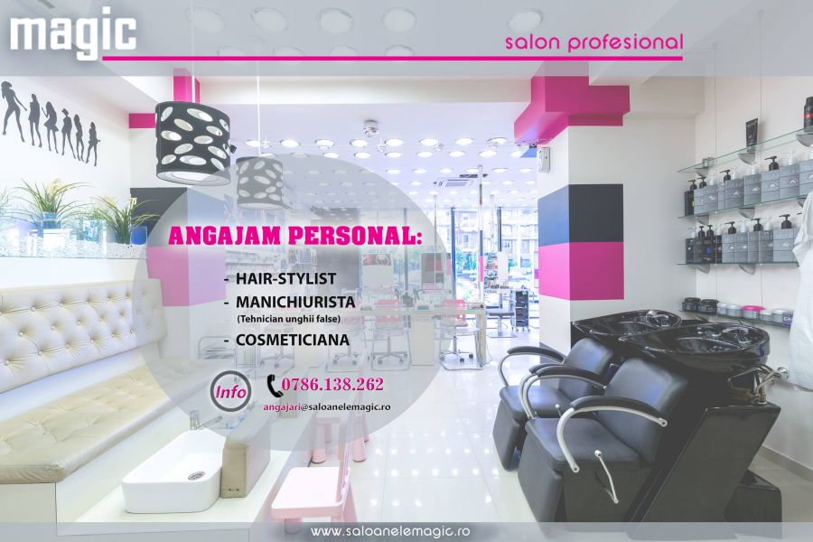 • Saloanele Magic Bucuresti angajeaza personal! Saloanele Magic angajeaza: COSMETICIENE, COAFEZE/HAIRSTYLISTI si MANICHIURISTA/ Tehnicieni Unghii False! Ai experienta intr-unul din aceste domenii? Vrei sa ai un salariu atractiv si bonusuri in functie de performanta? Daca raspunsurile tale sunt afirmative, nu ezita si trimite-ne datele tale sau CV-ul pe: angajari@saloanelemagic.ro! Otopeni, Rahova, Pantelimon, Dristor, Berceni, Militari si in curand Drumul Taberei.