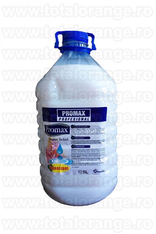 Total Orange va ofera din stoc cu livrare imediata sapun Promax lichid igienizant alb 5 litri pachet economic.