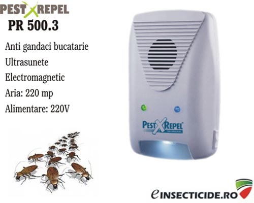 - Aparatul Pest Repel PR500.3 combina actiunea ultrasunetelor cu cea a undelor electromagnatice si a unei lampi stroboscopice, alungand daunatorii casei . Comenzi la numarul de telefon :0758101503 sau http://www.einsecticide.ro/oferta~solutii-gandaci~66