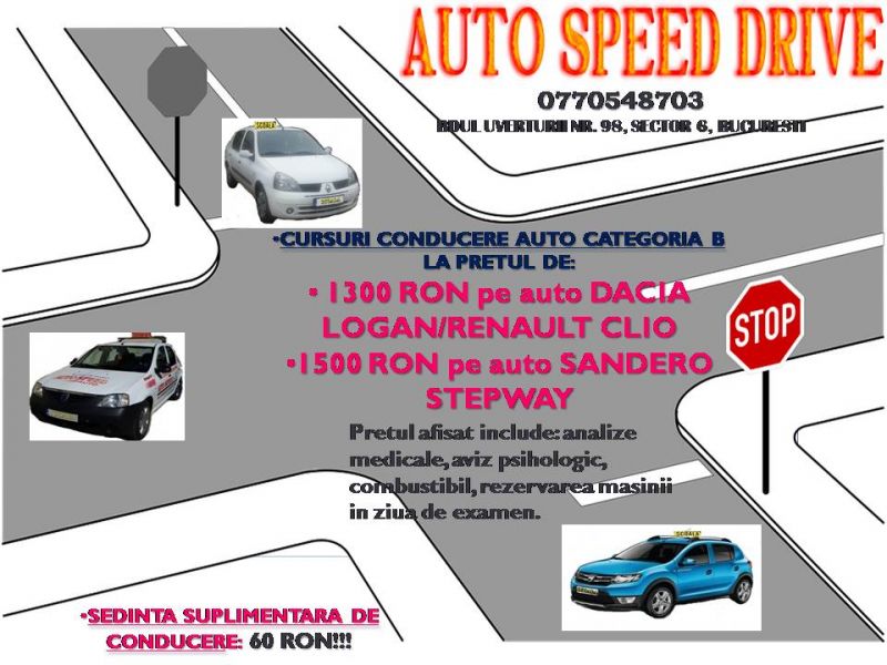 - AUTO SPEED DRIVE iti ofera cursuri scoala de soferi categoria B, curs legislatie rutiera cu instructori experimentati, calmi si obiectivi. Program flexibil, se lucreaza si in weekend.