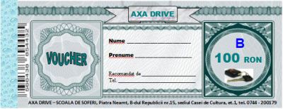 Promotie daca te prezinti cu voucherul ai reducere 100 lei . Daca recomanzi o persoana ce va folosi voucherul , ai garantat un comision de 50 lei . Nu uita sa-ti treci numele si numarul de telefon pe voucher . AXA DRIVE â In slujba calitatii !