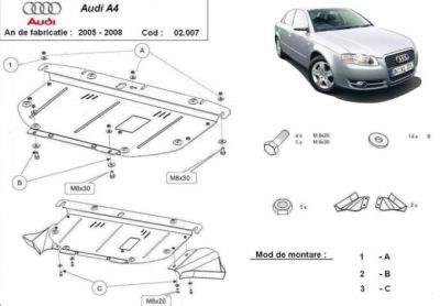 Scut motor metalic Audi A4 3 2005 - 2008. Scut motor metalic ce protejeaza motorul masinii si cutia de viteze. Scutul motor metalic este nou si se potriveste pe toate tipurile de motorizari de Audi A4 3 fabricate intre 2005 - 2008. Scutul motor se livreaza impreuna cu kit-ul de montaj iar montarea nu afecteaza garantia. Fabricat din tabla otel, prevazut cu intarituri longitudinale si vopsit electrostatic. Montarea nu implica modificari aduse masinii dvs. Pentru detalii contactati-ne.