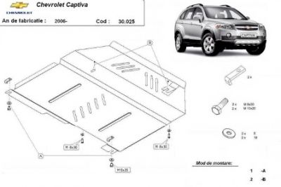 Scut motor Chevrolet Captiva incvepand cu 2006. Scut motor din otel vopsit in camp electrostatic cu intarituri aerisiri. Acest scut motor vine insotit de elementele de montaj si se monteaza pe toate modelele de Chevrolet Captiva, generatie aparuta incepand cu 2006. Montajul acestui scut motor se poate face la orice service. Acest scut motor este nou. Pentru detalii contactati-ne telefonic.