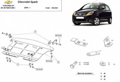 Scut motor Chevrolet Spark generatia dupa 2005. Scut motor ce protejeaza si cutia de viteze. Scut motor metalic cu armaturi, aerisiri si vizita ptr. schimbul de ulei. Scutul motor vine impreuna cu kit de montaj si schita. Acest scut motor se potriveste perfect pe toate motorizarile. Montarea scutului motor se face fara a aduce modificari masinii dumneavoastra. Pentru mai multe detalii contactati-ne.