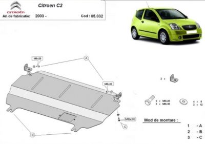 Scut motor metalic Citroen C2. Scut motor ce protejeaza si cutia de viteze. Acest scut motor este fabricat din tabla de otel de 2 mm. Montarea acestui scut motor se face prin fixarea lui prin suruburi de puntea fata si lonjeron. Pentru protectie acest scut motor este vopsit in camp electrostatic. Totodata scutul motor este prevazut cu vizita pentru schimbul de ulei. Pentru mai multe detalii despre acest scut motor contactati-ne.