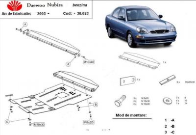 Scut motor metalic Daewoo Nubira dupa 2003. Protejeaza motorul masinii si cutia de viteze. Scutul motor metalic este nou si se potriveste perfect pentru toate tipurile de motorizari de Daewoo Nubira fabricate dupa 2003. Scutul motor se livreaza impreuna cu kit-ul de montaj iar montarea lui nu afecteaza garantia. Fabricat din tabla otel, prevazut cu intarituri longitudinale si vopsit electrostatic. Montarea acestui scut motor nu implica modificari aduse masinii dvs. Pentru detalii contactati-ne.
