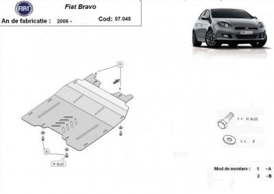 Scut motor Fiat Bravo dupa 2004. Scut motor din otel ce protejeaza motorul si cutia de viteze. Acest scut motor vine insotit de toate elementele de montaj. Montajul acestui scut motor se face foarte simplu la orice service. Acest scut motor se poate monta pe toate motorizarile. Acest scut motor este nou si este vopsit in camp electrostatic. Pentru mai multe detalii contactati-ne.
